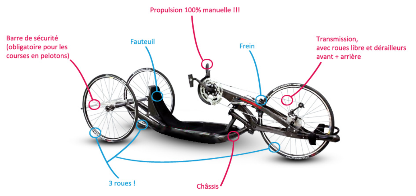 Les fauteuils adaptés aux sports sont tous différents mais possèdent cependant des similitudes pour les fauteuils manuels :